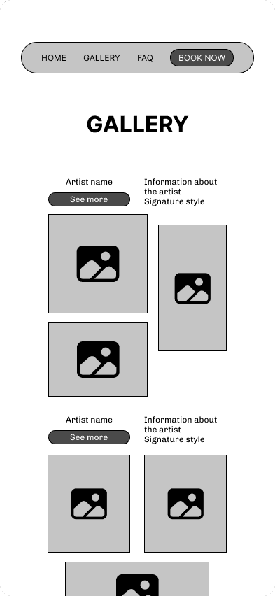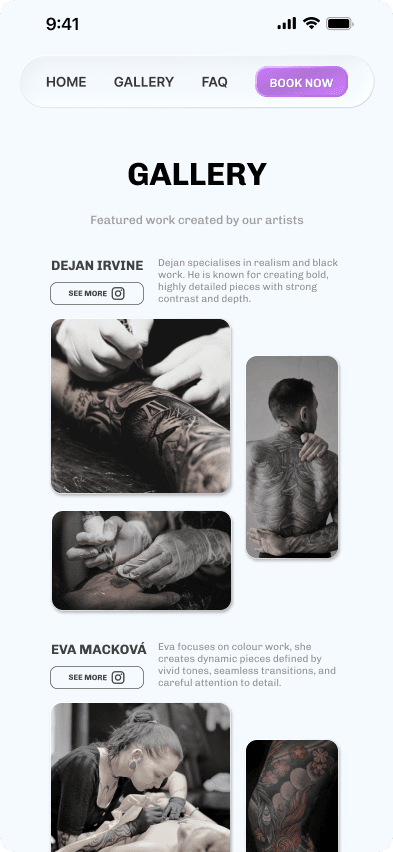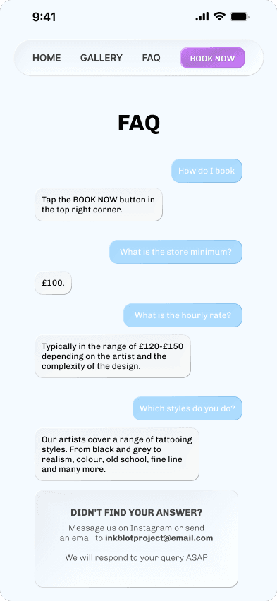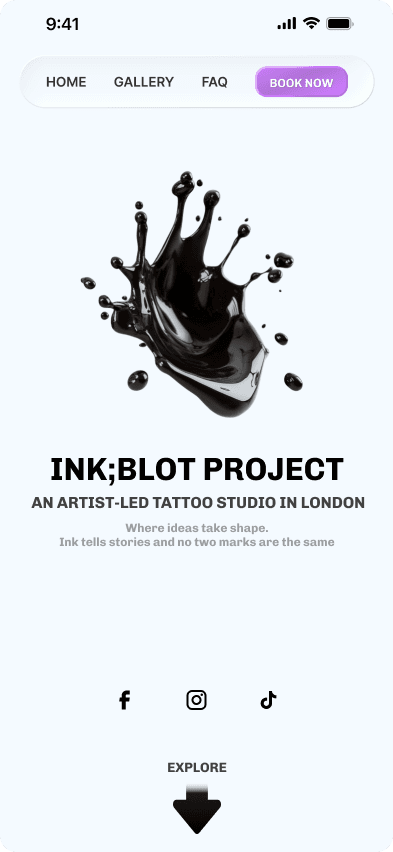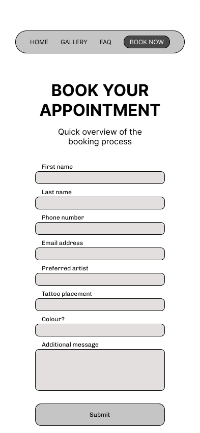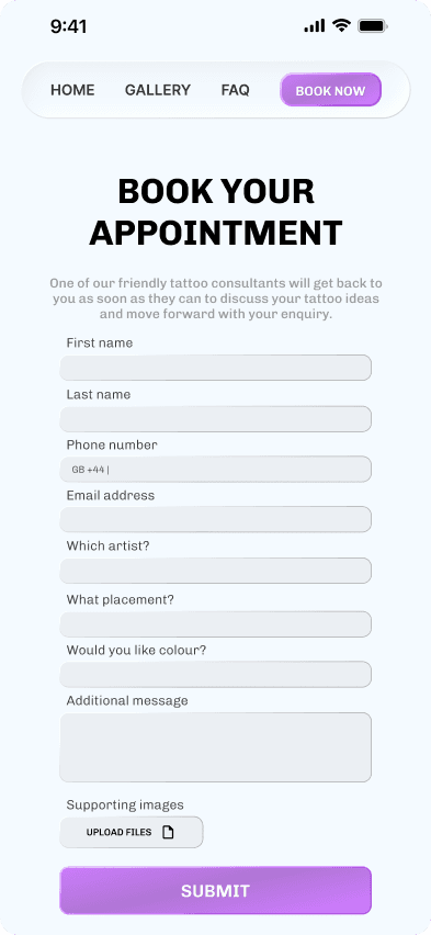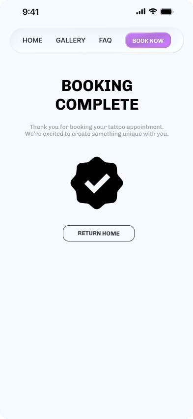 I was able to focus exclusively on designing an interface that will match the tattoo studio's requirements — a fresh modern experience for the user that will reassure them that they are in a safe and professional environment.