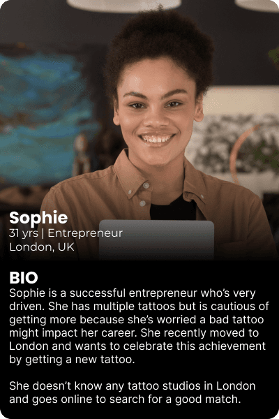 Key takeaway: Individuals with & without the experience of being tattooed need support and reassurance to successfully complete the booking process. They value the first impression when choosing a studio — it has to have a strong professional brand image but shouldn't feel too corporate and off putting. Another key point is that people need to be able to see good quality work to eliminate the fear of their first tattoo being a disaster. The same applies for first time customers with experience, they will have pre existing standards that will act as their minimum expectations.